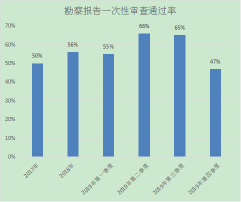 2019年第四季度我中心審查勘察報(bào)告共64項(xiàng)次,勘察報(bào)告一次性審查通過30項(xiàng)次,一次性審查通過率為47%,與往年勘察報(bào)告一次性審查通過率對(duì)比分析如下: