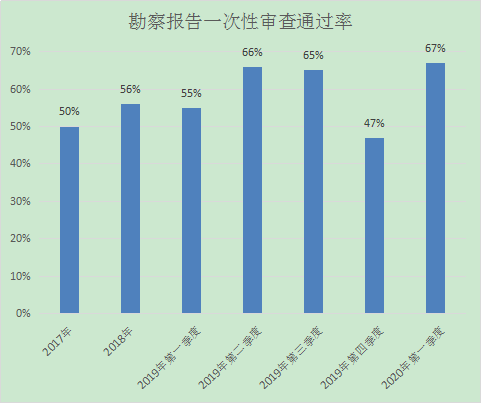 2019年第四季度我中心審查勘察報(bào)告共24項(xiàng)次,勘察報(bào)告一次性審查通過16項(xiàng)次,一次性審查通過率為67%,與往年勘察報(bào)告一次性審查通過率對(duì)比分析如下: