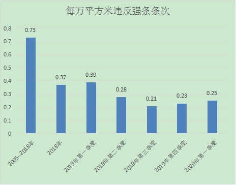 2020年第一季度我中心施工圖審查總建筑面積為205萬㎡,共審查出違反強(qiáng)制性條文51條,每萬平米違反強(qiáng)條0.25條次,與往年對(duì)比分析如下: