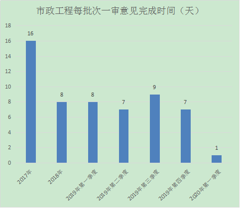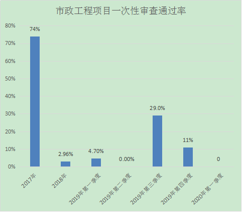 2020年第一季度我中心市政工程項(xiàng)目共審查1項(xiàng),一次性審查通過0項(xiàng),一次性審查通過率為0%;每批次一審意見完成時(shí)間為1天,與往年對(duì)比分析如下: