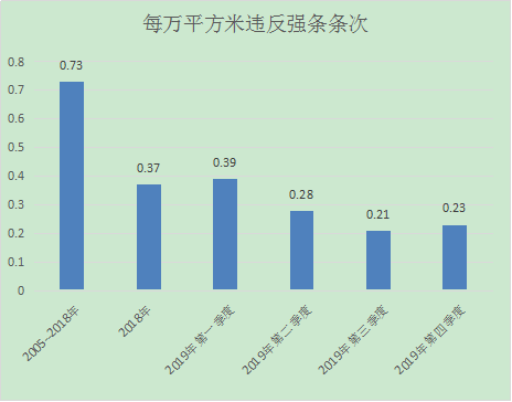 2019年第四季度我中心施工圖審查總建筑面積為278萬㎡,共審查出違反強(qiáng)制性條文64條,每萬平米違反強(qiáng)條0.23條次,與往年對(duì)比分析如下: