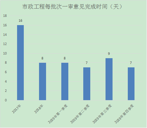 2019年第三季度我中心市政工程項(xiàng)目共審查9項(xiàng),一次性審查通過1項(xiàng),一次性審查通過率為11%;每批次一審意見完成時(shí)間為7天,與往年對(duì)比分析如下: