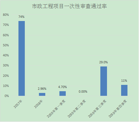 2019年第三季度我中心市政工程項目共審查9項,一次性審查通過(guò)1項,一次性審查通過(guò)率為11%;每批次一審意見(jiàn)完成時(shí)間為7天,與往年對比分析如下: